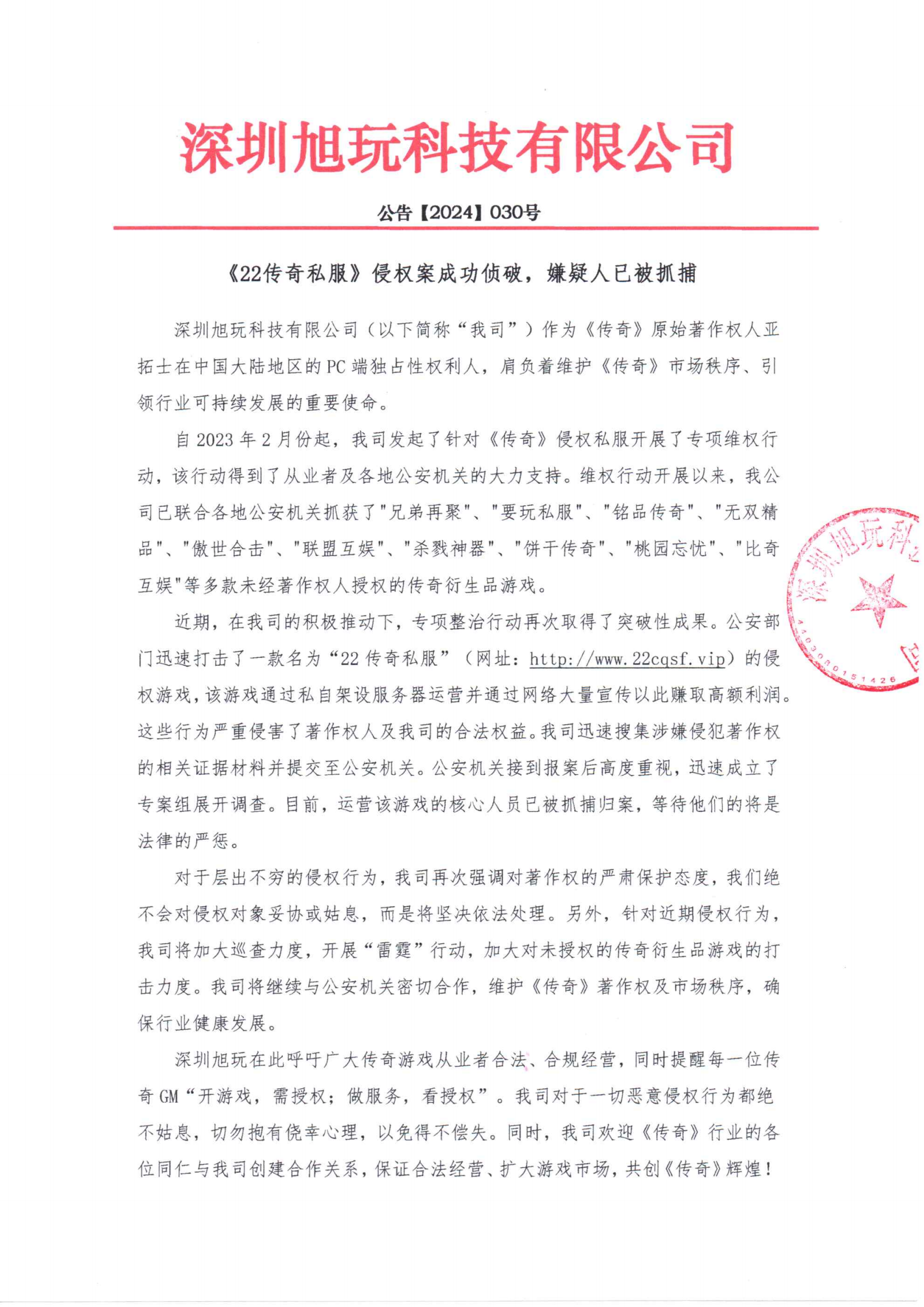 深圳旭玩在此呼吁廣大傳奇游戲從業(yè)者合法、合規(guī)經(jīng)營(yíng),同時(shí)提醒每一位傳奇GM“開游戲,需授權(quán);做服務(wù),看授權(quán)”。我司對(duì)于一切惡意侵權(quán)行為都絕不姑息,切勿抱有僥幸心理,以免得不償失。同時(shí),我司歡迎《傳奇》行業(yè)的各位同仁與我司創(chuàng)建合作關(guān)系,保證合法經(jīng)營(yíng)、擴(kuò)大游戲市場(chǎng),共創(chuàng)《傳奇》輝煌!
