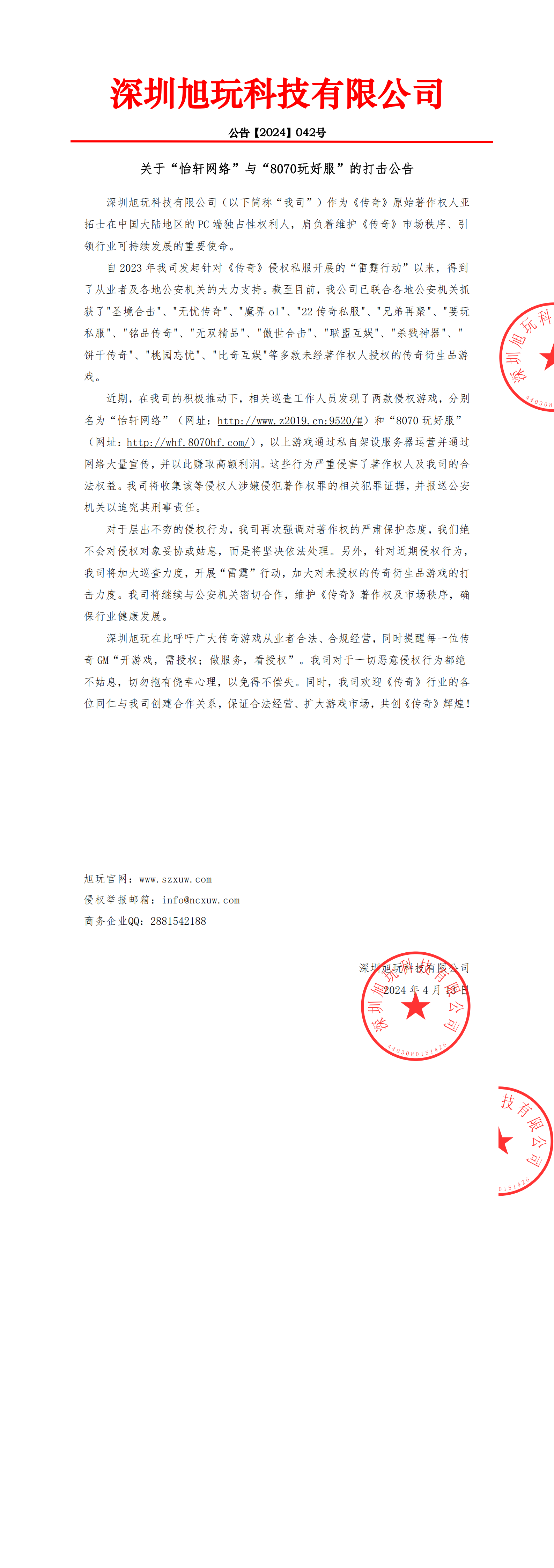 深圳旭玩在此呼吁廣大傳奇游戲從業者合法、合規經營,同時提醒每一位傳奇GM“開游戲,需授權;做服務,看授權”。我司對于一切惡意侵權行為都絕不姑息,切勿抱有僥幸心理,以免得不償失。同時,我司歡迎《傳奇》行業的各位同仁與我司創建合作關系,保證合法經營、擴大游戲市場,共創《傳奇》輝煌!