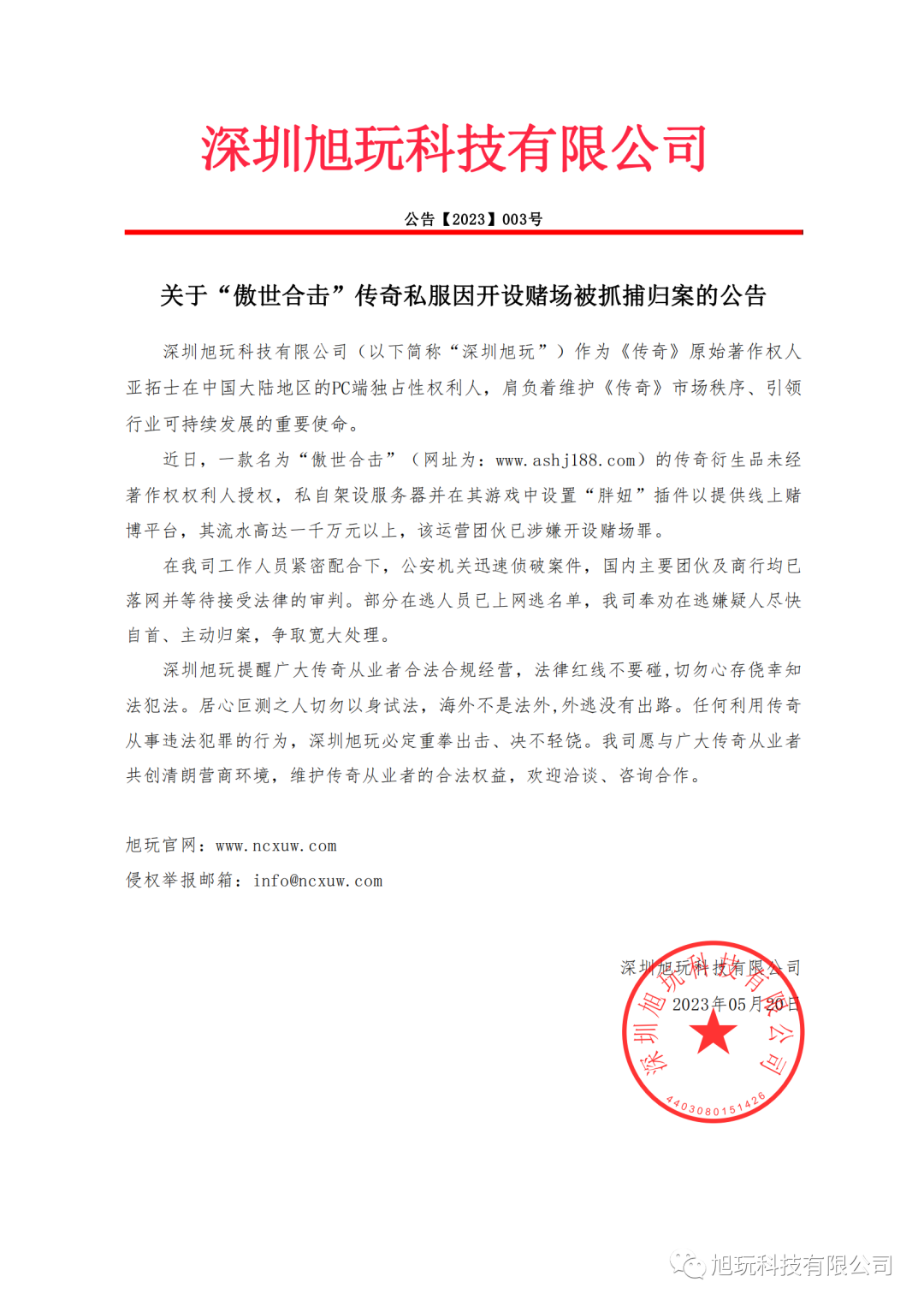 深圳旭玩提醒廣大傳奇從業者合法合規經營,法律紅線不要碰,切勿心存僥幸知法犯法。居心叵測之人切勿以身試法,海外不是法外,外逃沒有出路。任何利用傳奇從事違法犯罪的行為,深圳旭玩必定重拳出擊、決不輕饒。我司愿與廣大傳奇從業者共創清朗營商環境,維護傳奇從業者的合法權益,歡迎洽談、咨詢合作。