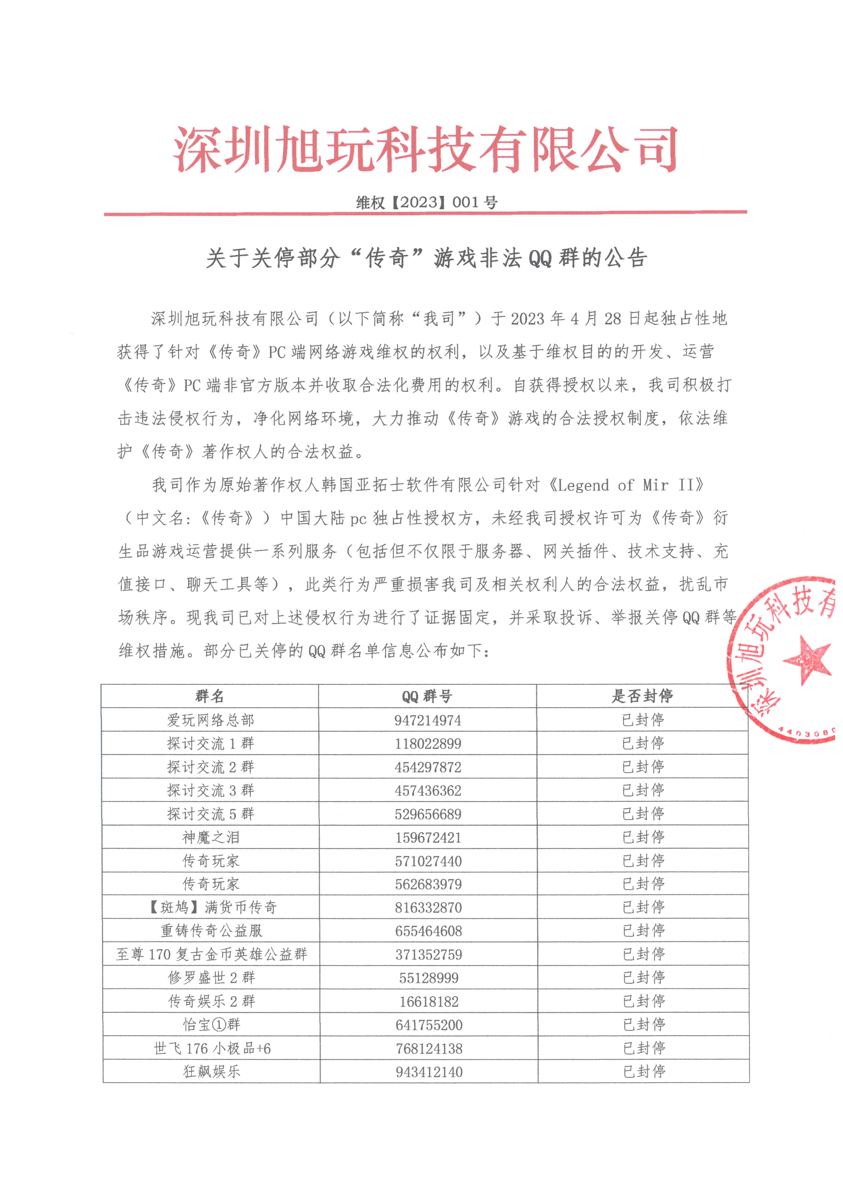 我司作為原始著作權人韓國亞拓士軟件有限公司針對《Legend of Mir II》(中文名:《傳奇》)中國大陸pc獨占性授權方,未經我司授權許可為《傳奇》衍生品游戲運營提供一系列服務(包括但不僅限于服務器、網關插件、技術支持、充值接口、聊天工具等),此類行為嚴重損害我司及相關權利人的合法權益,擾亂市場秩序。現我司已對上述侵權行為進行了證據固定,并采取投訴、舉報關停QQ群等維權措施。部分已關停的QQ群名單信息公布如下:
