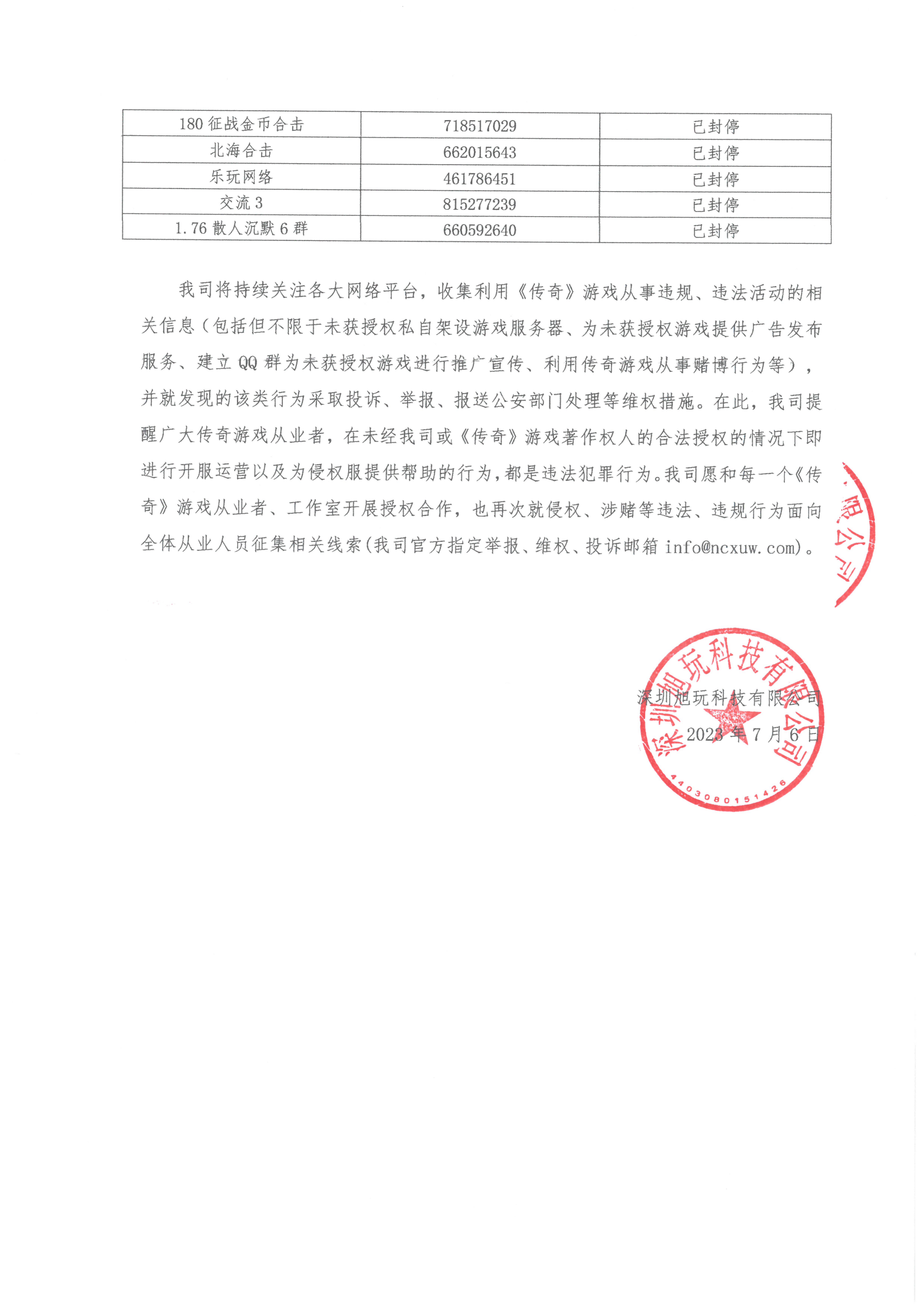 我司將持續(xù)關(guān)注各大網(wǎng)絡(luò)平臺,收集利用《傳奇》游戲從事違規(guī)、違法活動的相關(guān)信息(包括但不限于未獲授權(quán)私自架設(shè)游戲服務(wù)器、為未獲授權(quán)游戲提供廣告發(fā)布服務(wù)、建立QQ群為未獲授權(quán)游戲進行推廣宣傳、利用傳奇游戲從事賭博行為等),并就發(fā)現(xiàn)的該類行為采取投訴、舉報、報送公安部門處理等維權(quán)措施。在此,我司提醒廣大傳奇游戲從業(yè)者,在未經(jīng)我司或《傳奇》游戲著作權(quán)人的合法授權(quán)的情況下即進行開服運營以及為侵權(quán)服提供幫助的行為,都是違法犯罪行為。我司愿和每一個《傳奇》游戲從業(yè)者、工作室開展授權(quán)合作,也再次就侵權(quán)、涉賭等違法、違規(guī)行為面向全體從業(yè)人員征集相關(guān)線索(我司官方指定舉報、維權(quán)、投訴郵箱info@ncxuw.com)。