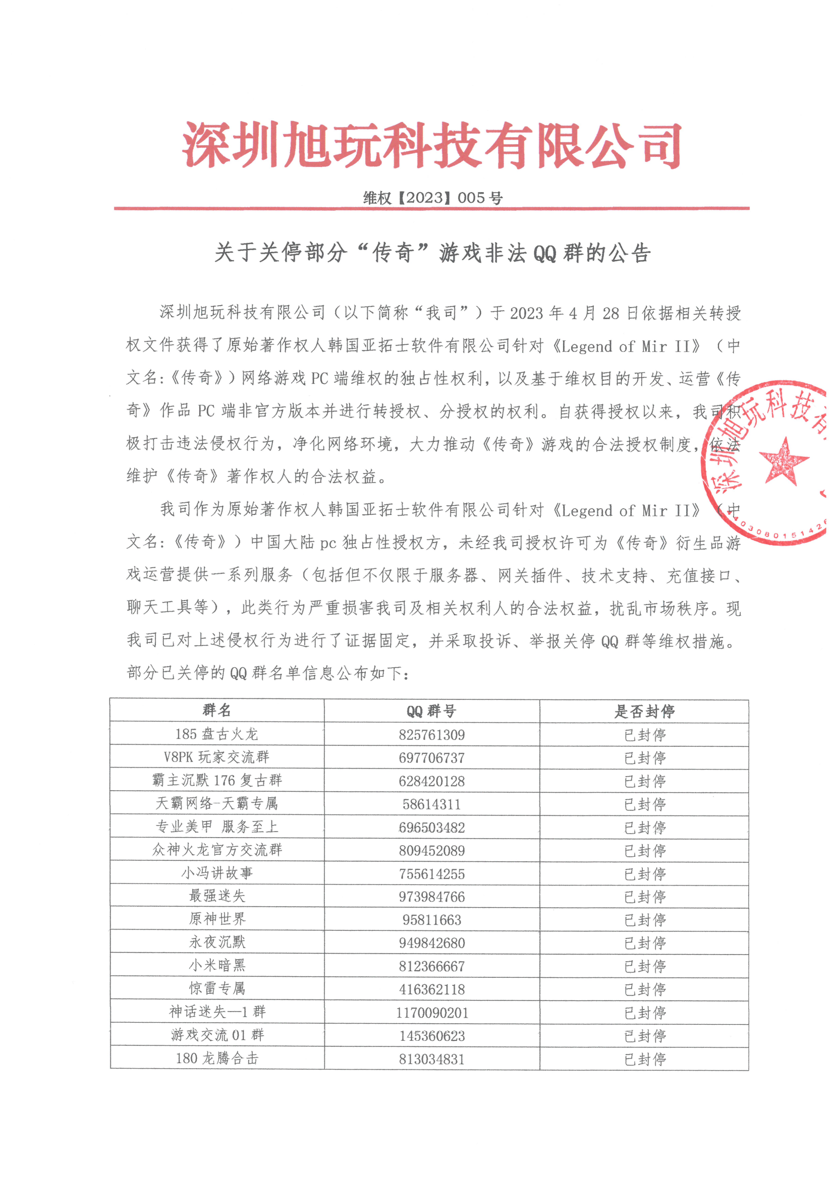 我司作為原始著作權(quán)人韓國亞拓士軟件有限公司針對《Legend of Mir II》(中文名:《傳奇》)中國大陸pc獨占性授權(quán)方,未經(jīng)我司授權(quán)許可為《傳奇》衍生品游戲運營提供一系列服務(wù)(包括但不僅限于服務(wù)器、網(wǎng)關(guān)插件、技術(shù)支持、充值接口、聊天工具等),此類行為嚴(yán)重損害我司及相關(guān)權(quán)利人的合法權(quán)益,擾亂市場秩序?,F(xiàn)我司已對上述侵權(quán)行為進行了證據(jù)固定,并采取投訴、舉報關(guān)停QQ群等維權(quán)措施。部分已關(guān)停的QQ群名單信息公布如下: