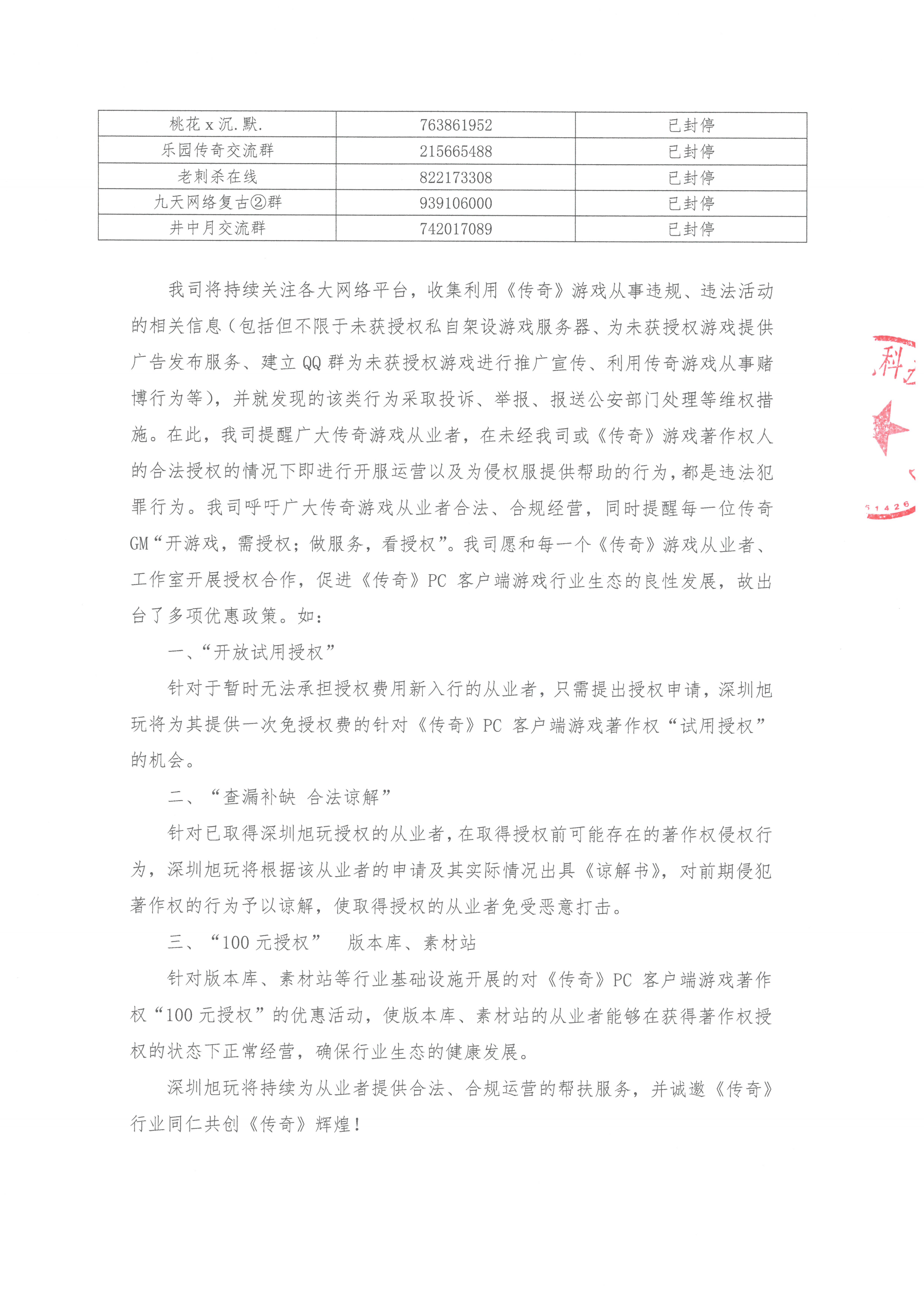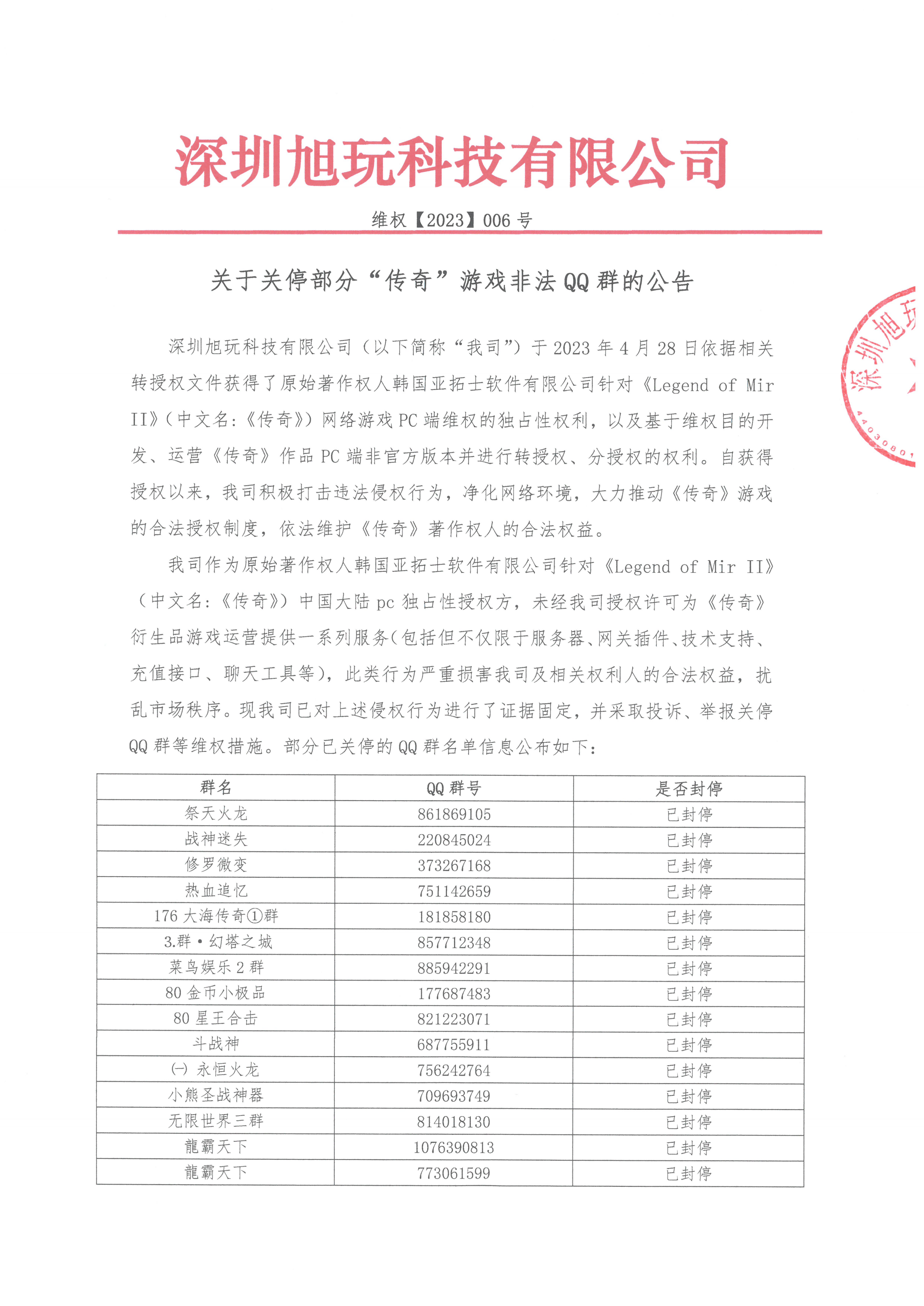 我司作為原始著作權人韓國亞拓士軟件有限公司針對《Legend of Mir II》(中文名:《傳奇》)中國大陸pc獨占性授權方,未經(jīng)我司授權許可為《傳奇》衍生品游戲運營提供一系列服務(包括但不僅限于服務器、網(wǎng)關插件、技術支持、充值接口、聊天工具等),此類行為嚴重損害我司及相關權利人的合法權益,擾亂市場秩序。現(xiàn)我司已對上述侵權行為進行了證據(jù)固定,并采取投訴、舉報關停QQ群等維權措施。部分已關停的QQ群名單信息公布如下: