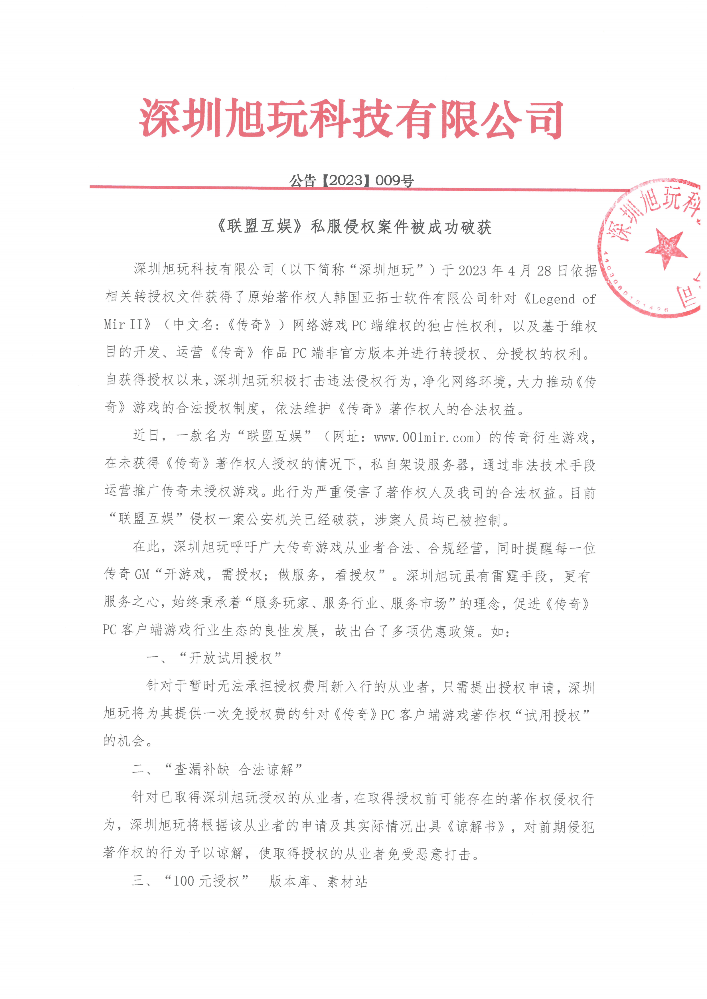 深圳旭玩科技有限公司(以下簡稱“深圳旭玩”)于2023年4月28日依據相關轉授權文件獲得了原始著作權人韓國亞拓士軟件有限公司針對《Legend of Mir II》(中文名:《傳奇》)網絡游戲PC端維權的獨占性權利,以及基于維權目的開發、運營《傳奇》作品PC端非官方版本并進行轉授權、分授權的權利。自獲得授權以來,深圳旭玩積極打擊違法侵權行為,凈化網絡環境,大力推動《傳奇》游戲的合法授權制度,依法維護《傳奇》著作權人的合法權益。