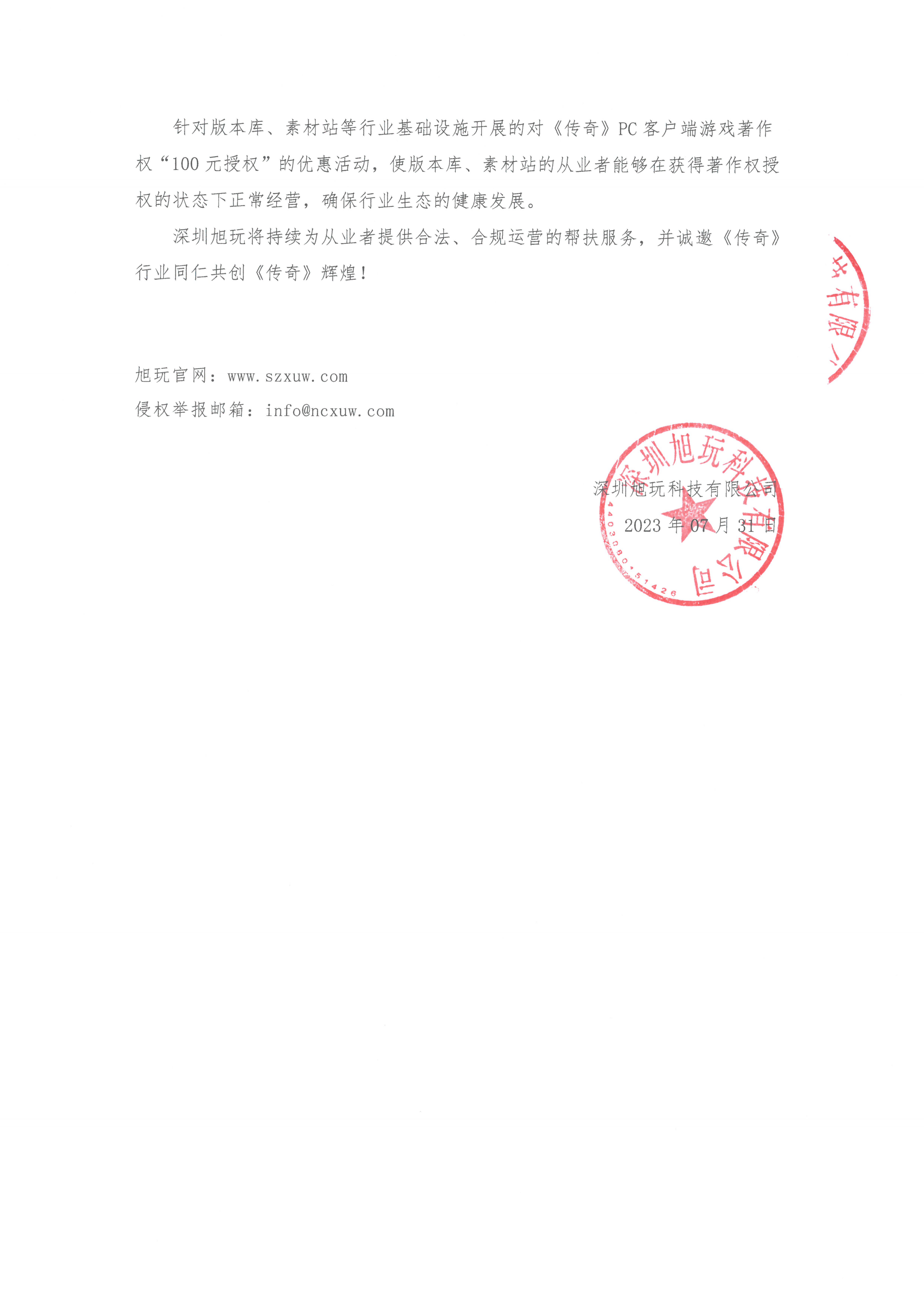針對版本庫、素材站等行業基礎設施開展的對《傳奇》PC客戶端游戲著作權“100元授權”的優惠活動,使版本庫、素材站的從業者能夠在獲得著作權授權的狀態下正常經營,確保行業生態的健康發展。 深圳旭玩將持續為從業者提供合法、合規運營的幫扶服務,并誠邀《傳奇》行業同仁共創《傳奇》輝煌!
