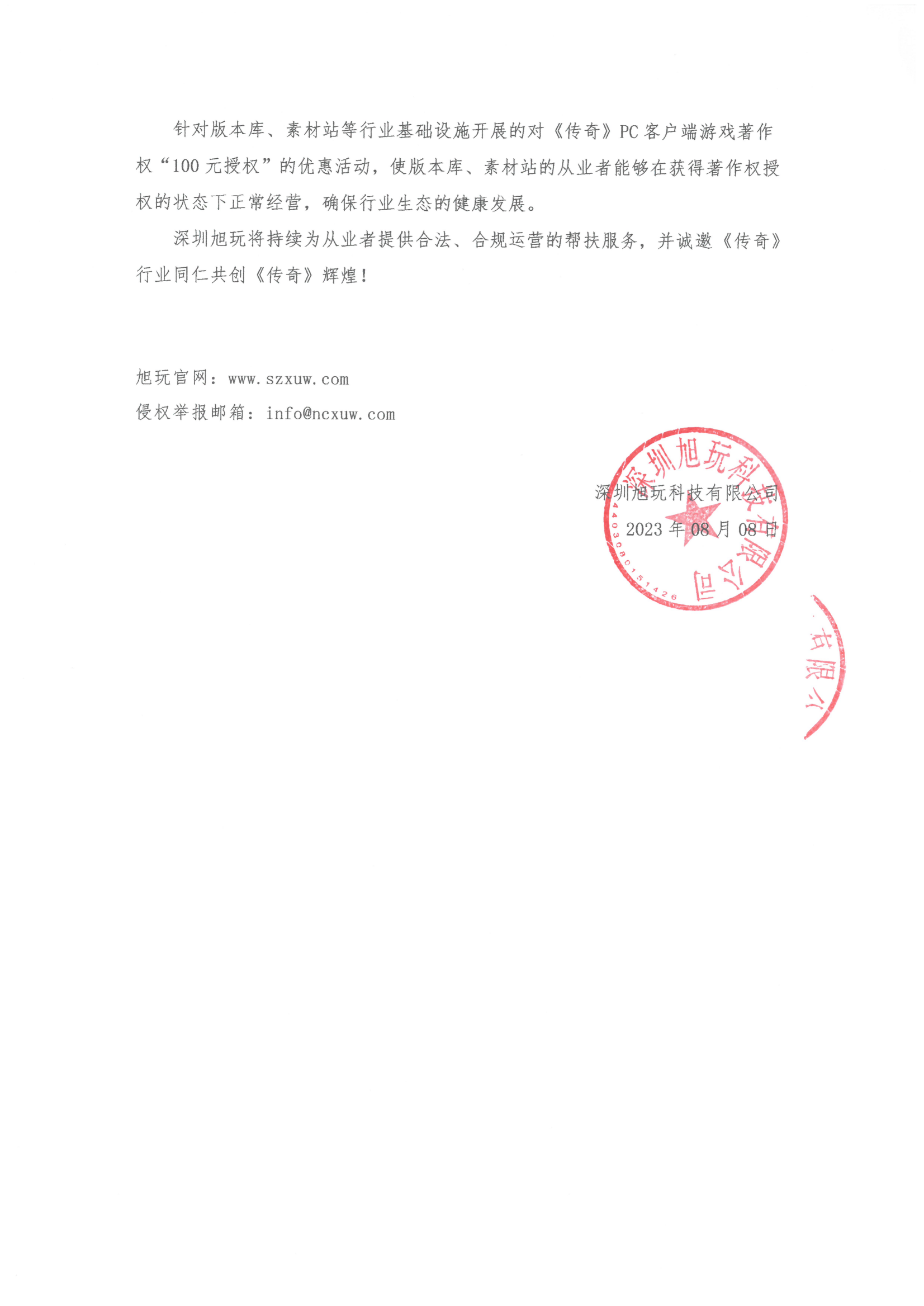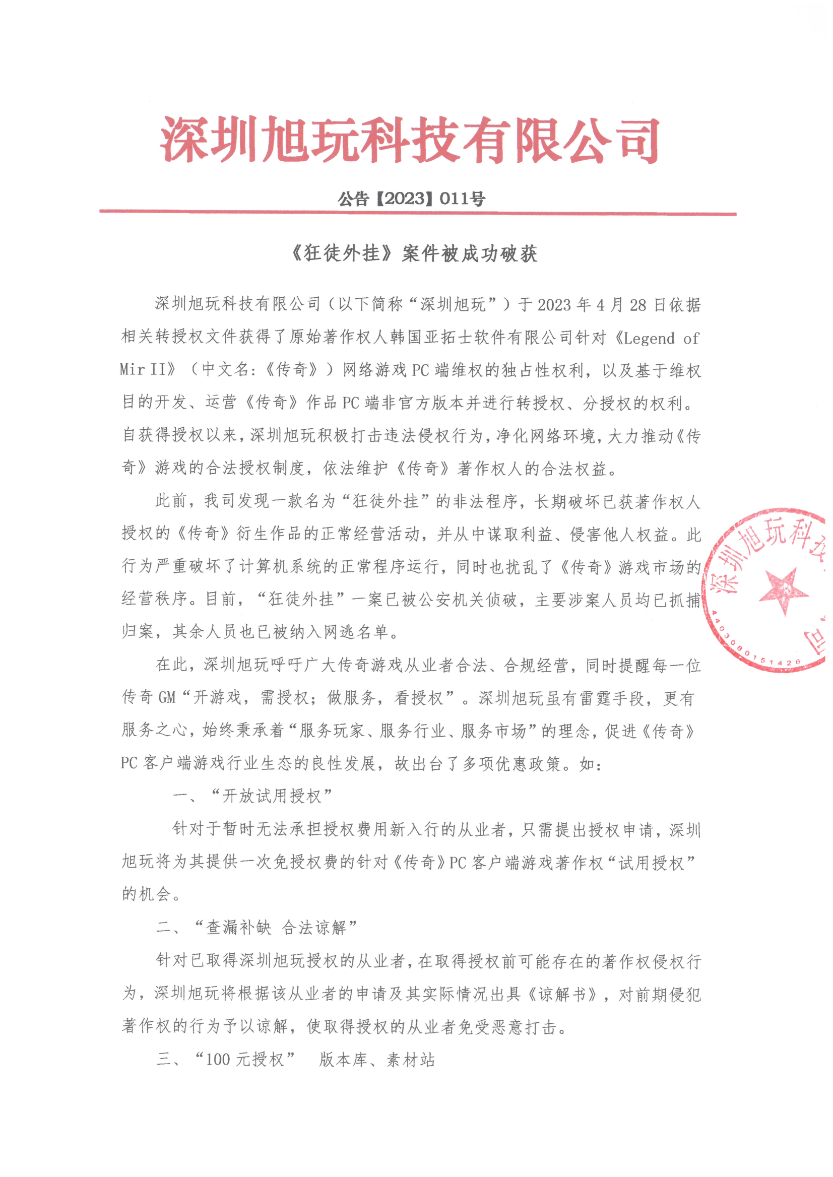 深圳旭玩科技有限公司(以下簡稱“深圳旭玩”)于2023年4月28日依據相關轉授權文件獲得了原始著作權人韓國亞拓士軟件有限公司針對《Legend of Mir II》(中文名:《傳奇》)網絡游戲PC端維權的獨占性權利,以及基于維權目的開發、運營《傳奇》作品PC端非官方版本并進行轉授權、分授權的權利。自獲得授權以來,深圳旭玩積極打擊違法侵權行為,凈化網絡環境,大力推動《傳奇》游戲的合法授權制度,依法維護《傳奇》著作權人的合法權益。
