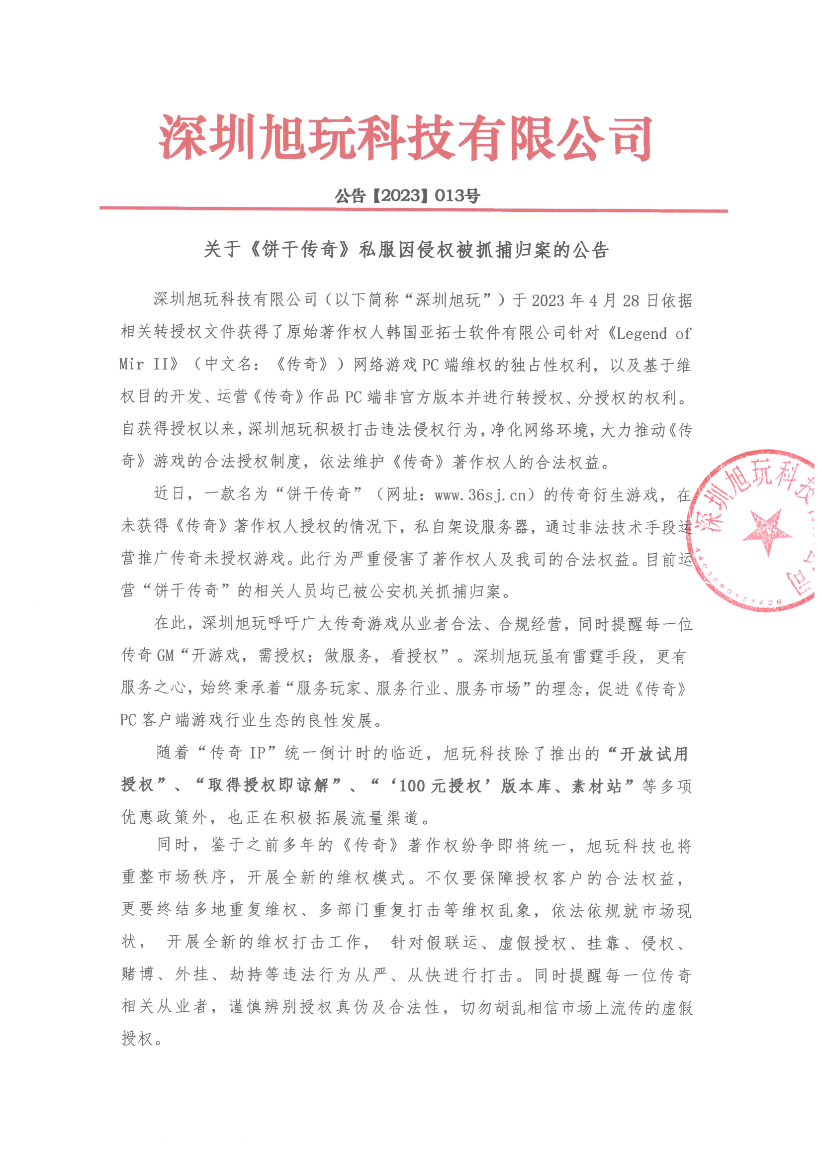 深圳旭玩科技有限公司(以下簡稱“深圳旭玩”)于2023年4月28日依據(jù)相關(guān)轉(zhuǎn)授權(quán)文件獲得了原始著作權(quán)人韓國亞拓士軟件有限公司針對《Legend of Mir II》(中文名:《傳奇》)網(wǎng)絡(luò)游戲PC端維權(quán)的獨占性權(quán)利,以及基于維權(quán)目的開發(fā)、運營《傳奇》作品PC端非官方版本并進(jìn)行轉(zhuǎn)授權(quán)、分授權(quán)的權(quán)利。自獲得授權(quán)以來,深圳旭玩積極打擊違法侵權(quán)行為,凈化網(wǎng)絡(luò)環(huán)境,大力推動《傳奇》游戲的合法授權(quán)制度,依法維護(hù)《傳奇》著作權(quán)人的合法權(quán)益。