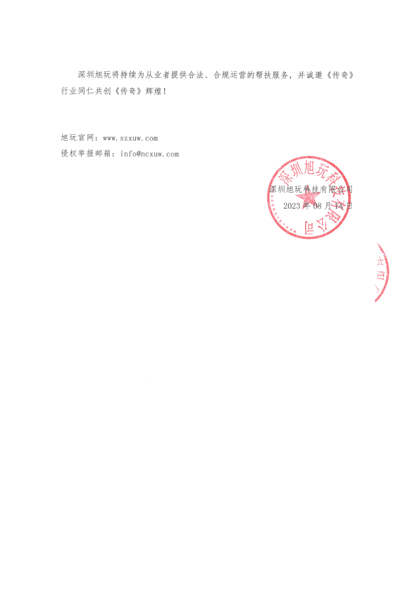 深圳旭玩將持續(xù)為從業(yè)者提供合法、合規(guī)運營的幫扶服務(wù),并誠邀《傳奇》行業(yè)同仁共創(chuàng)《傳奇》輝煌!