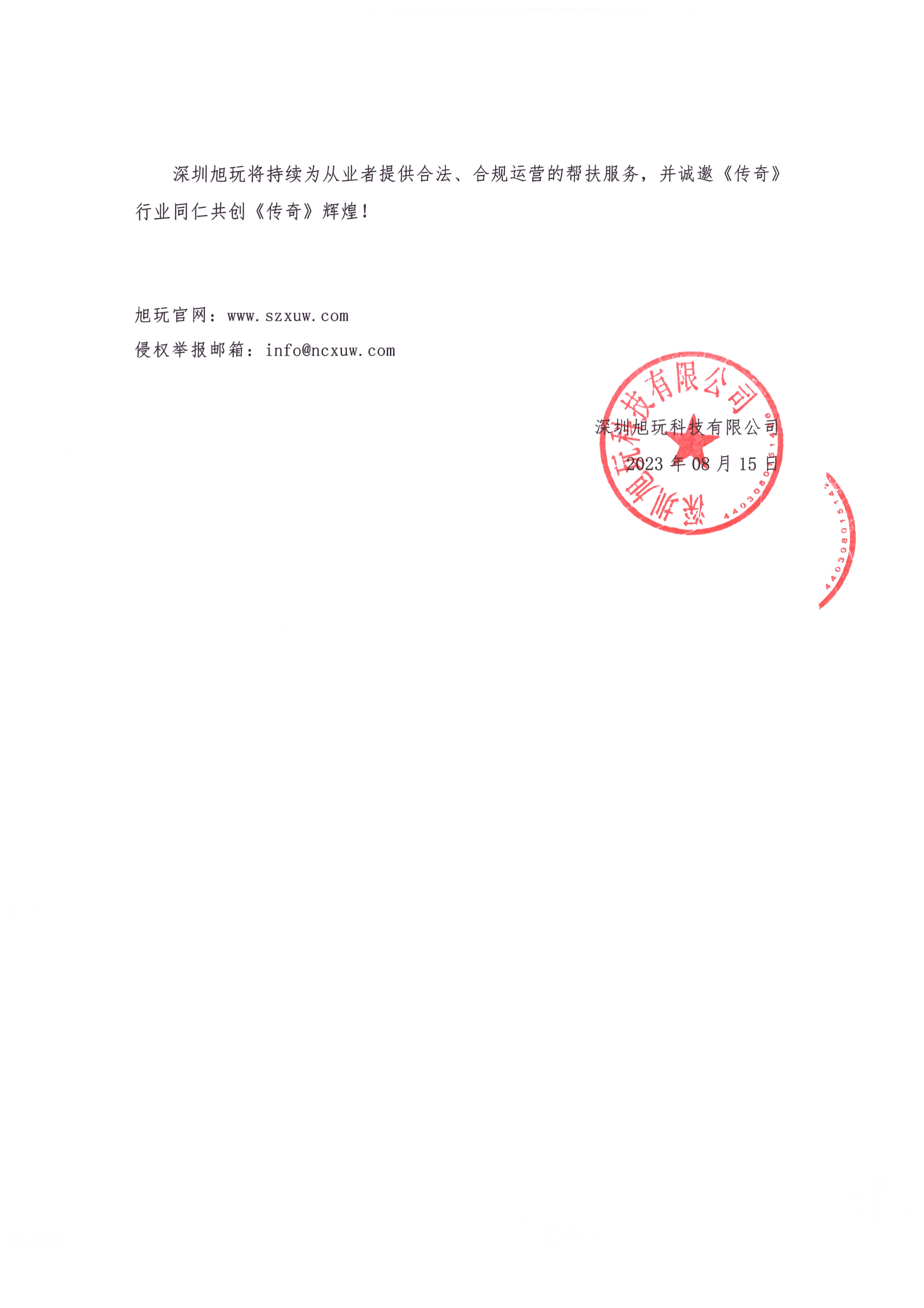 深圳旭玩將持續為從業者提供合法、合規運營的幫扶服務,并誠邀《傳奇》行業同仁共創《傳奇》輝煌!