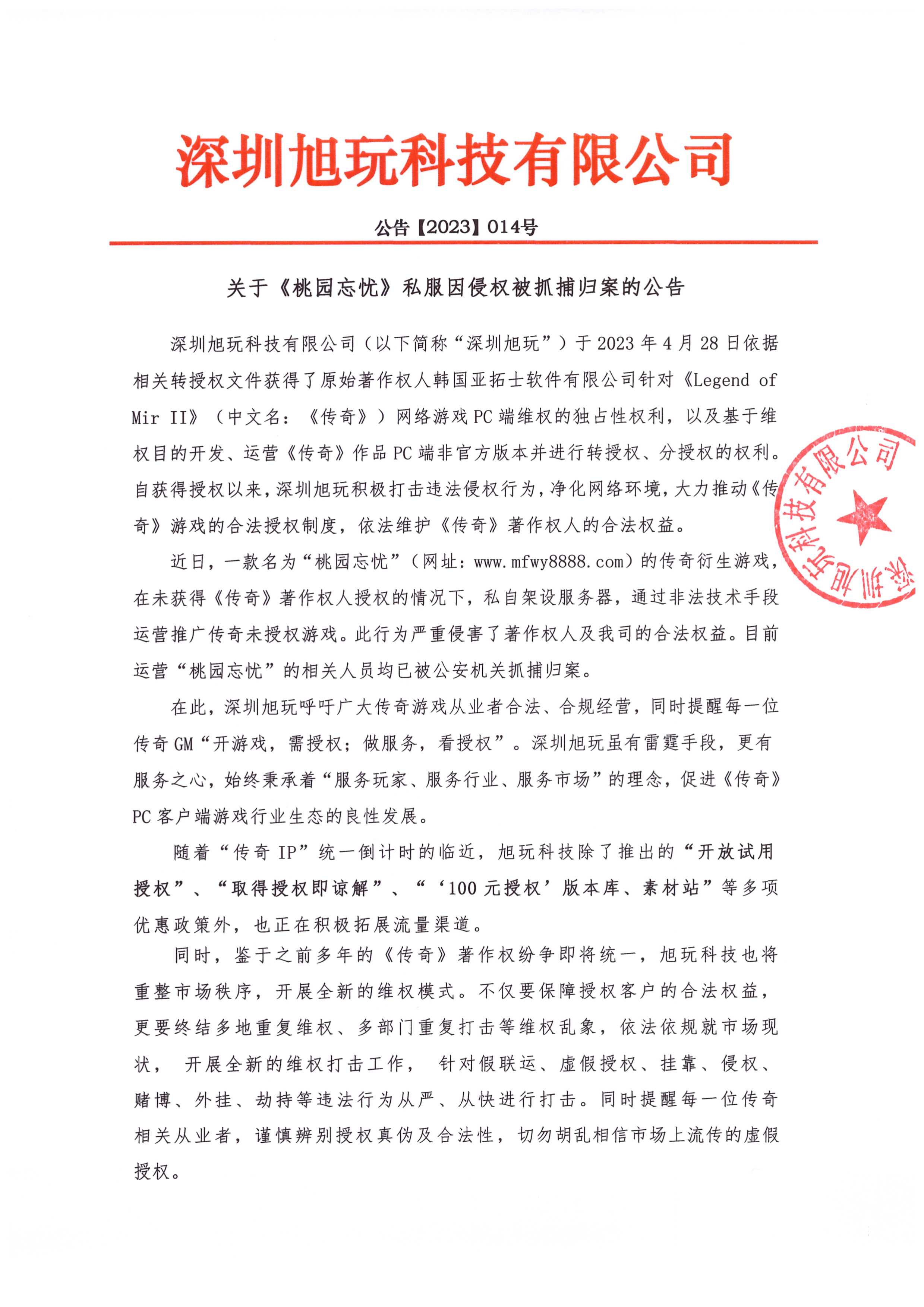 深圳旭玩科技有限公司(以下簡稱“深圳旭玩”)于2023年4月28日依據相關轉授權文件獲得了原始著作權人韓國亞拓士軟件有限公司針對《Legend of Mir II》(中文名:《傳奇》)網絡游戲PC端維權的獨占性權利,以及基于維權目的開發、運營《傳奇》作品PC端非官方版本并進行轉授權、分授權的權利。自獲得授權以來,深圳旭玩積極打擊違法侵權行為,凈化網絡環境,大力推動《傳奇》游戲的合法授權制度,依法維護《傳奇》著作權人的合法權益。