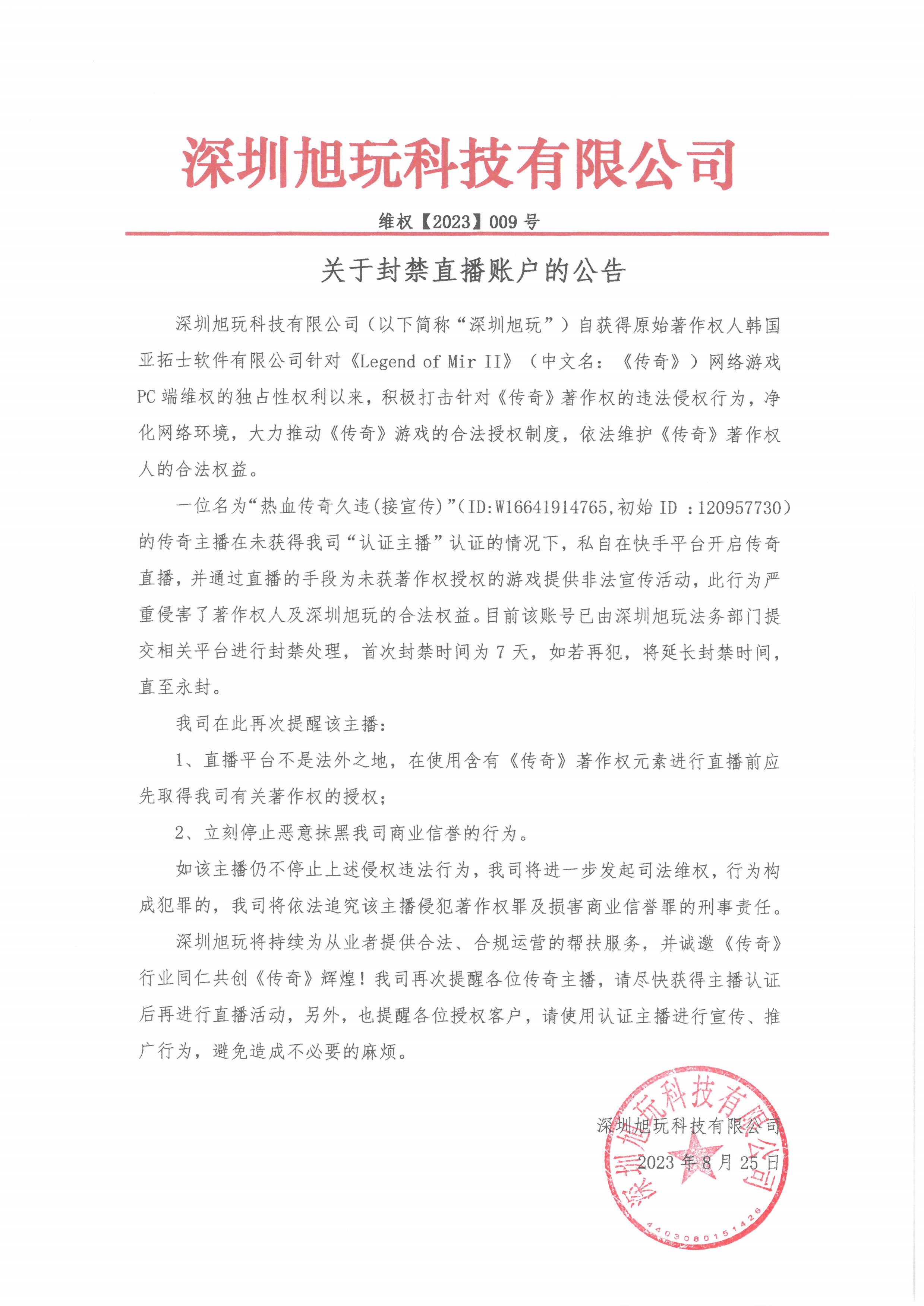 一位名為“熱血傳奇久違(接宣傳)”(ID:W16641914765,初始ID :120957730)的傳奇主播在未獲得我司“認證主播”認證的情況下,私自在快手平臺開啟傳奇直播,并通過直播的手段為未獲著作權授權的游戲提供非法宣傳活動,此行為嚴重侵害了著作權人及深圳旭玩的合法權益。目前該賬號已由深圳旭玩法務部門提交相關平臺進行封禁處理,首次封禁時間為7天,如若再犯,將延長封禁時間,直至永封。