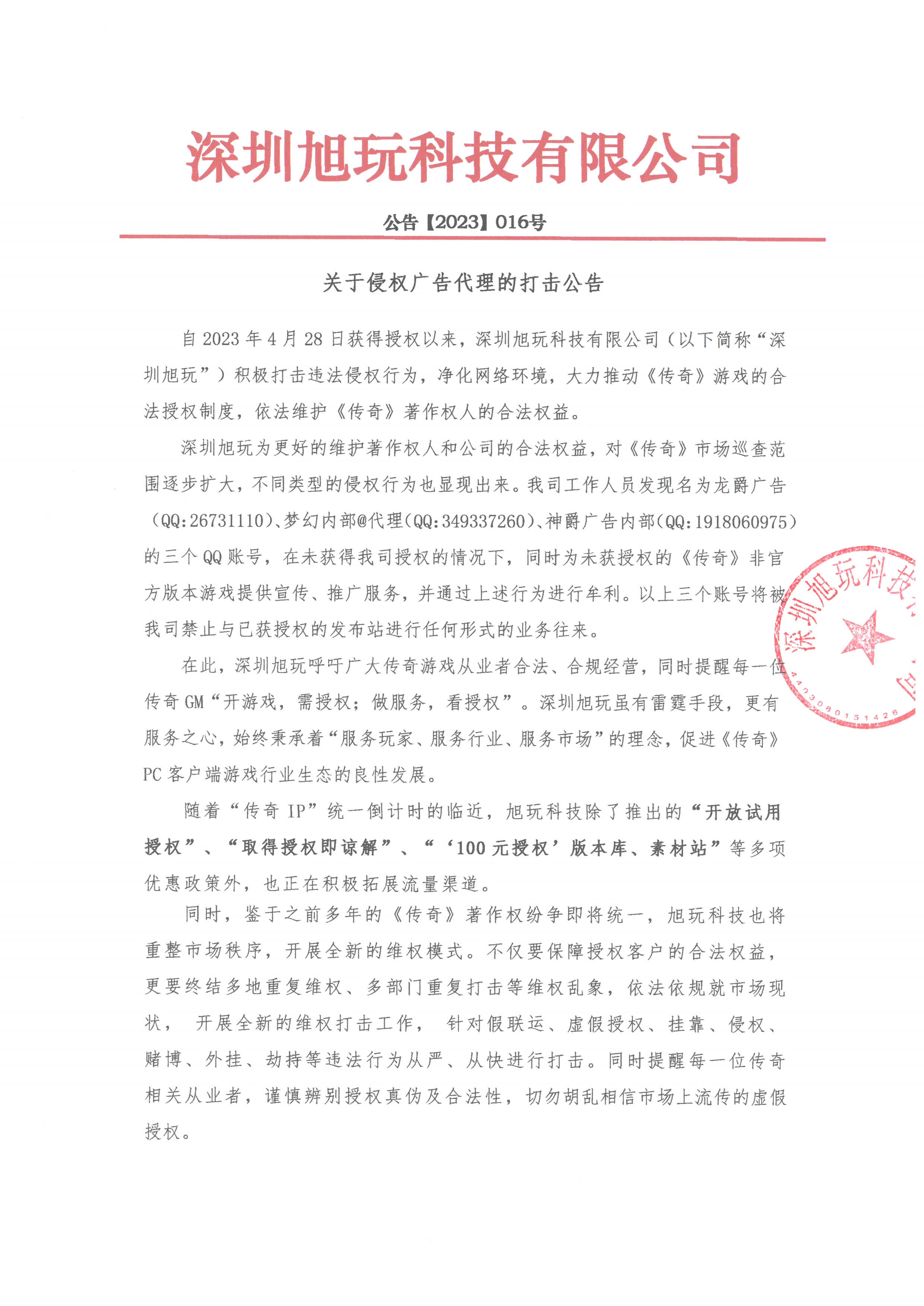 深圳旭玩為更好的維護著作權人和公司的合法權益,對《傳奇》市場巡查范圍逐步擴大,不同類型的侵權行為也顯現出來。我司工作人員發現名為龍爵廣告(QQ:26731110)、夢幻內部@代理(QQ:349337260)、神爵廣告內部(QQ:1918060975)的三個QQ賬號,在未獲得我司授權的情況下,同時為未獲授權的《傳奇》非官方版本游戲提供宣傳、推廣服務,并通過上述行為進行牟利。以上三個賬號將被我司禁止與已獲授權的發布站進行任何形式的業務往來。
