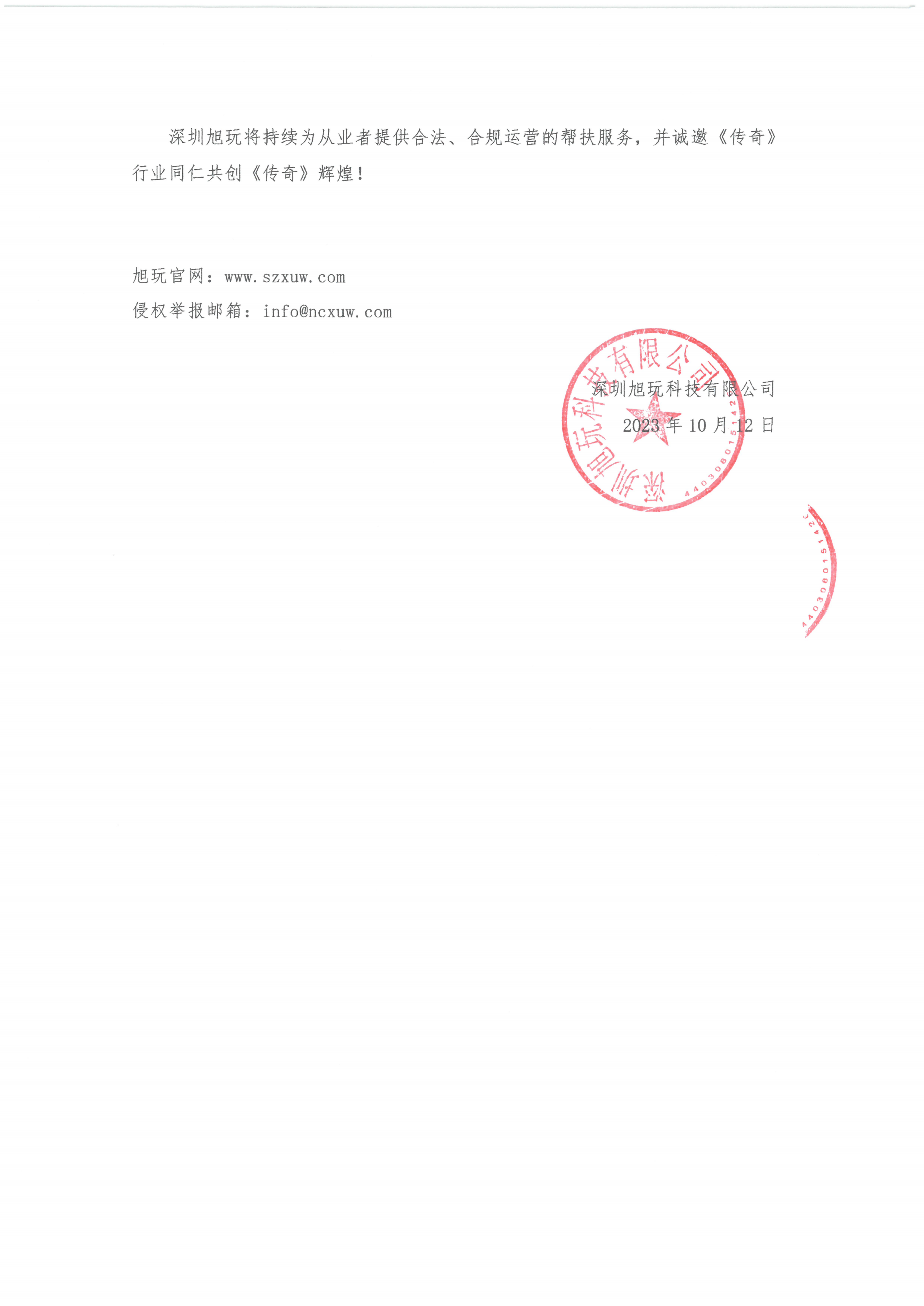 深圳旭玩將持續為從業者提供合法、合規運營的幫扶服務,并誠邀《傳奇》行業同仁共創《傳奇》輝煌!