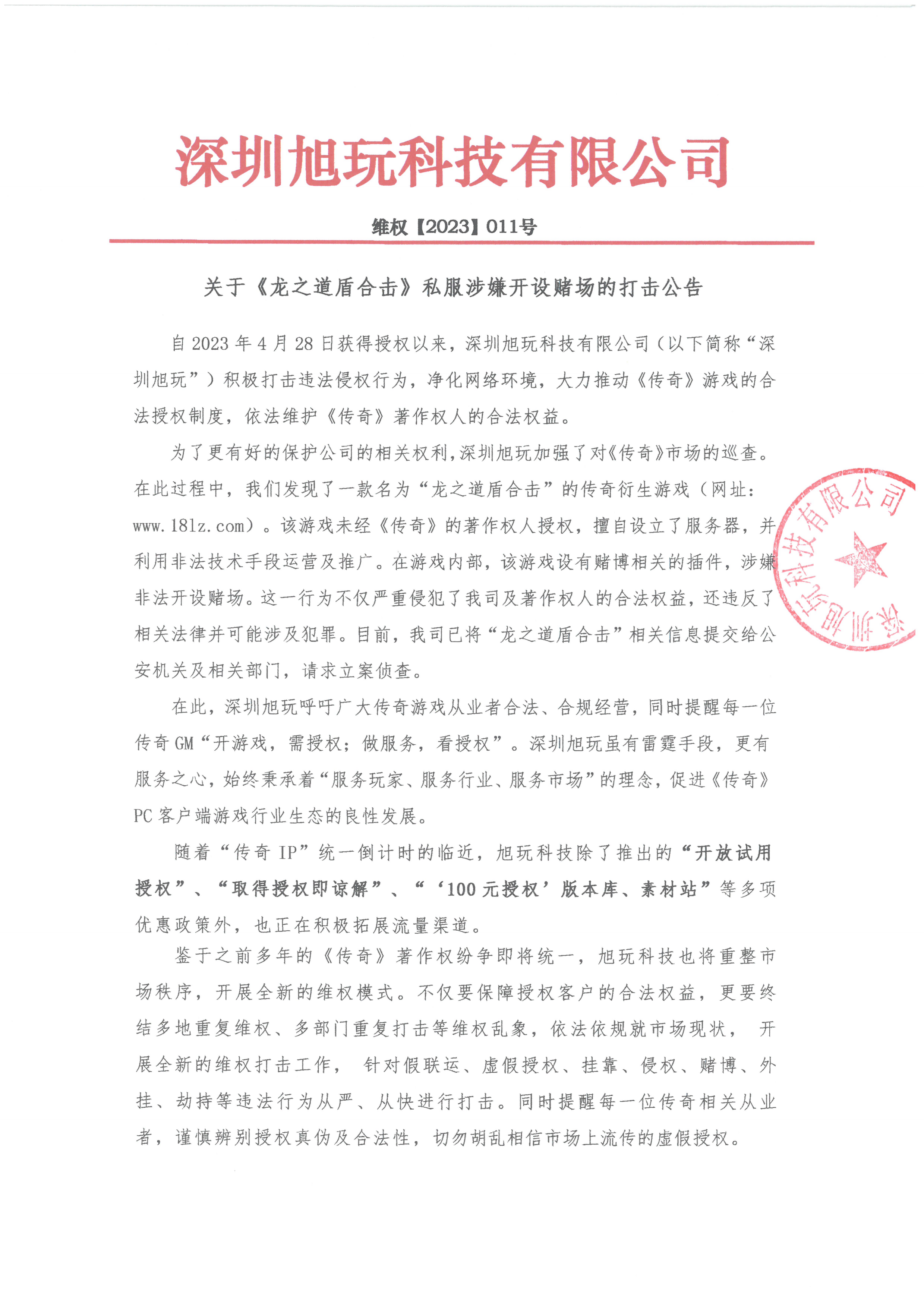 自2023年4月28日獲得授權以來,深圳旭玩科技有限公司(以下簡稱“深圳旭玩”)積極打擊違法侵權行為,凈化網絡環境,大力推動《傳奇》游戲的合法授權制度,依法維護《傳奇》著作權人的合法權益。