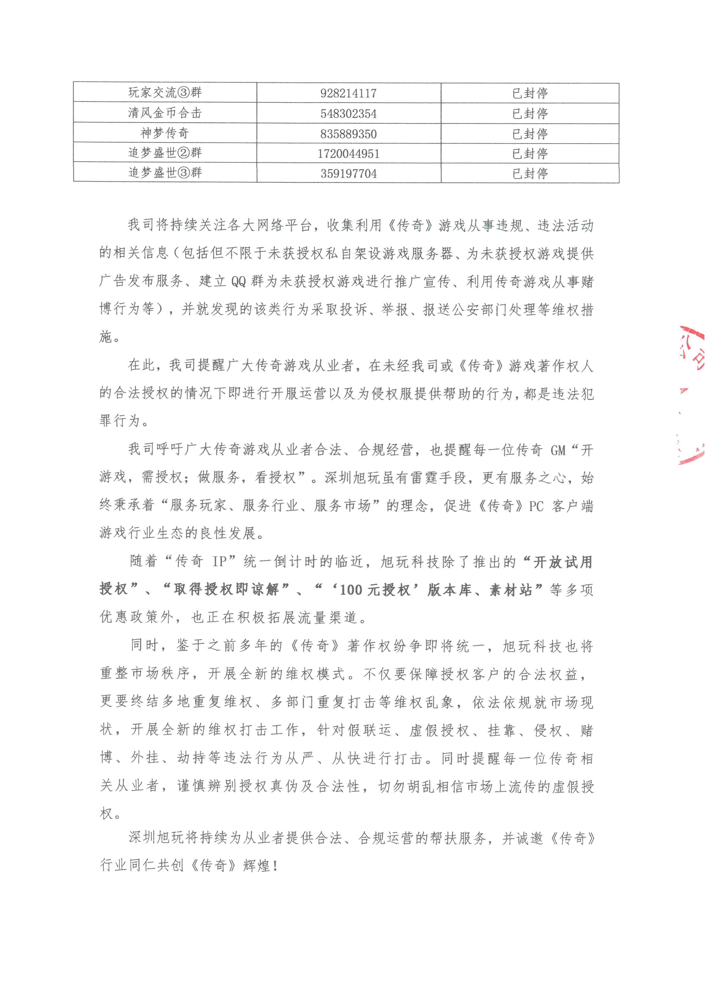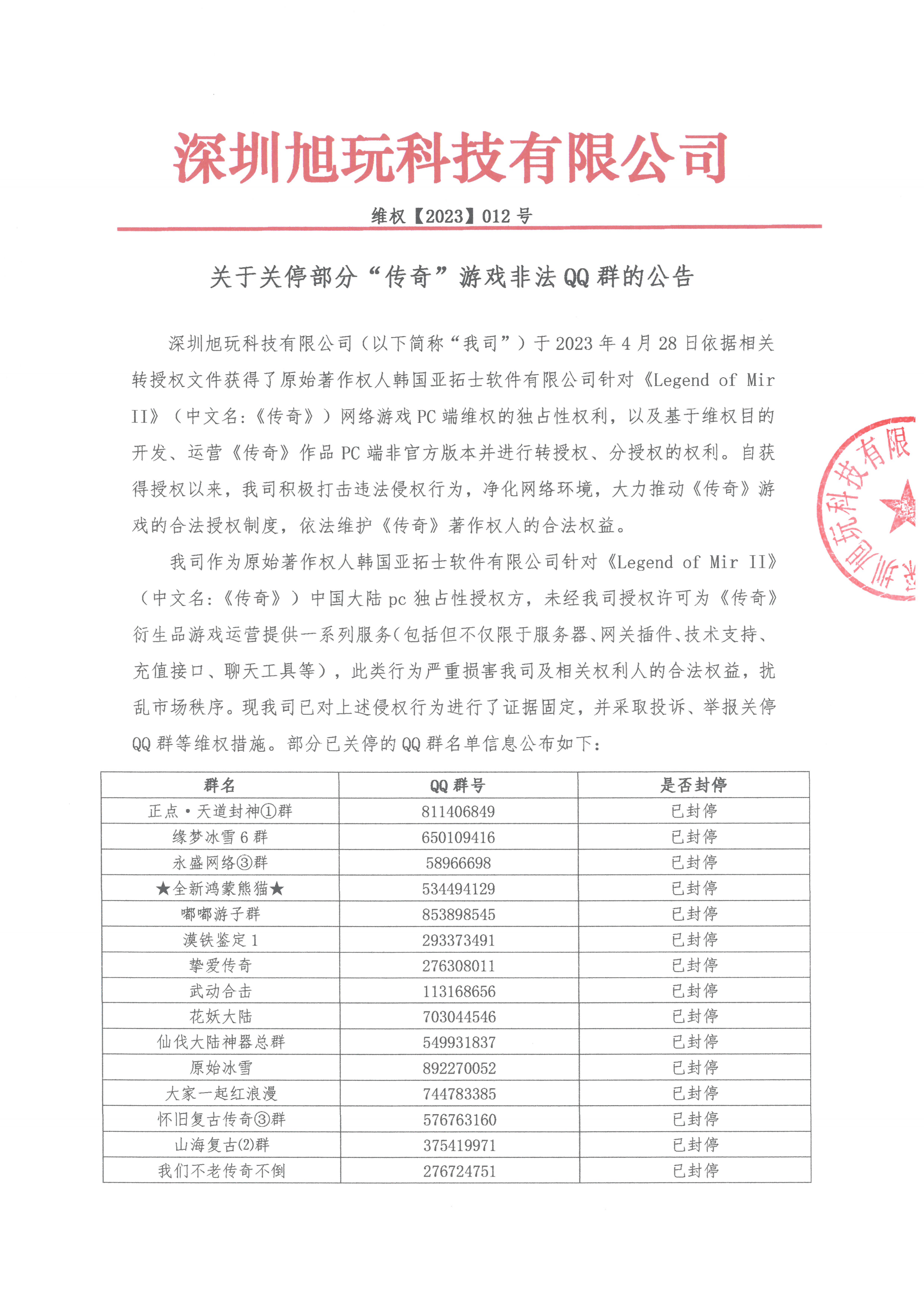 我司作為原始著作權人韓國亞拓士軟件有限公司針對《Legend of Mir II》(中文名:《傳奇》)中國大陸pc獨占性授權方,未經我司授權許可為《傳奇》衍生品游戲運營提供一系列服務(包括但不僅限于服務器、網關插件、技術支持、充值接口、聊天工具等),此類行為嚴重損害我司及相關權利人的合法權益,擾亂市場秩序。現我司已對上述侵權行為進行了證據固定,并采取投訴、舉報關停QQ群等維權措施。部分已關停的QQ群名單信息公布如下: