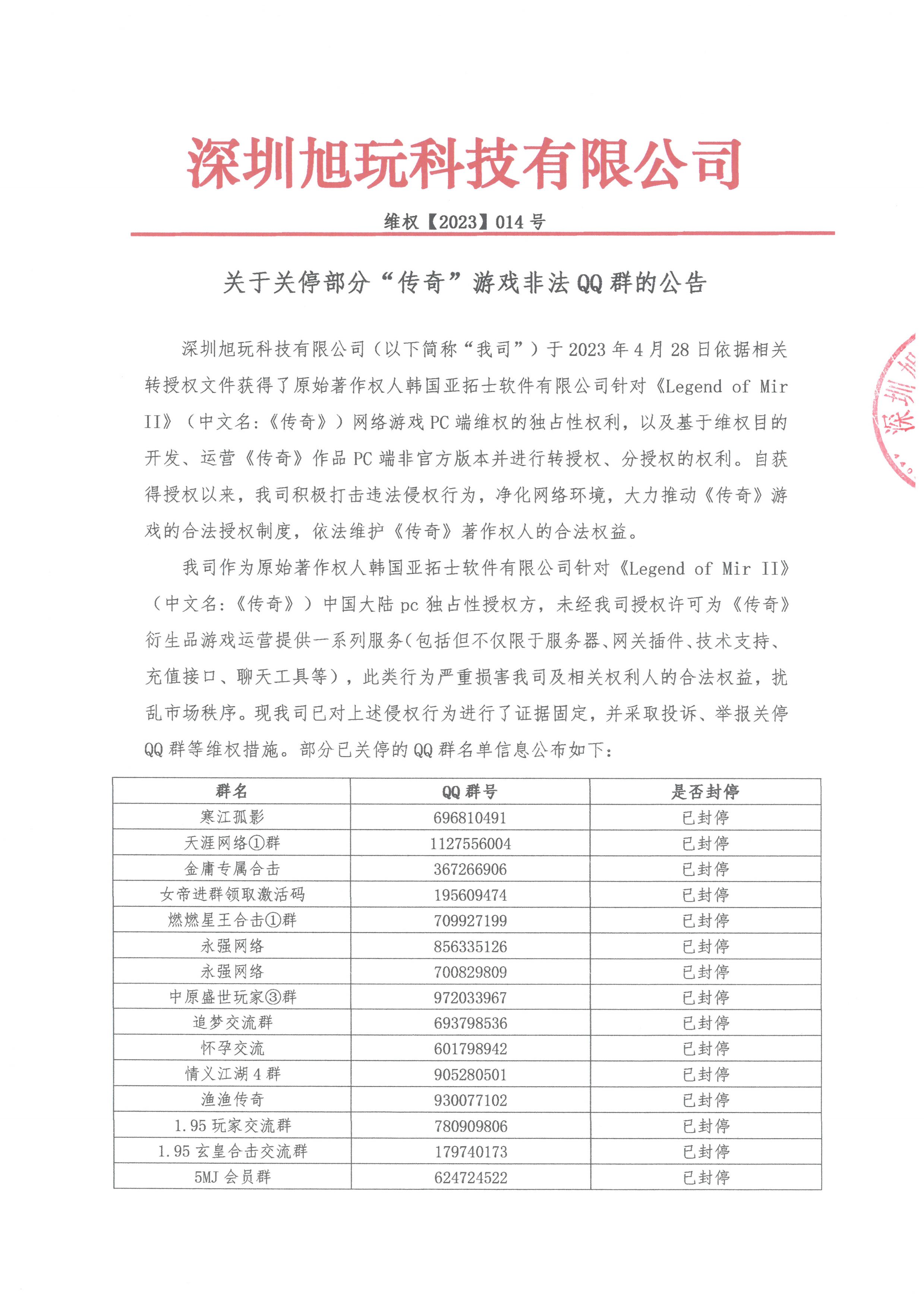 我司作為原始著作權人韓國亞拓士軟件有限公司針對《Legend of Mir II》(中文名:《傳奇》)中國大陸pc獨占性授權方,未經我司授權許可為《傳奇》衍生品游戲運營提供一系列服務(包括但不僅限于服務器、網關插件、技術支持、充值接口、聊天工具等),此類行為嚴重損害我司及相關權利人的合法權益,擾亂市場秩序。現我司已對上述侵權行為進行了證據固定,并采取投訴、舉報關停QQ群等維權措施。部分已關停的QQ群名單信息公布如下: