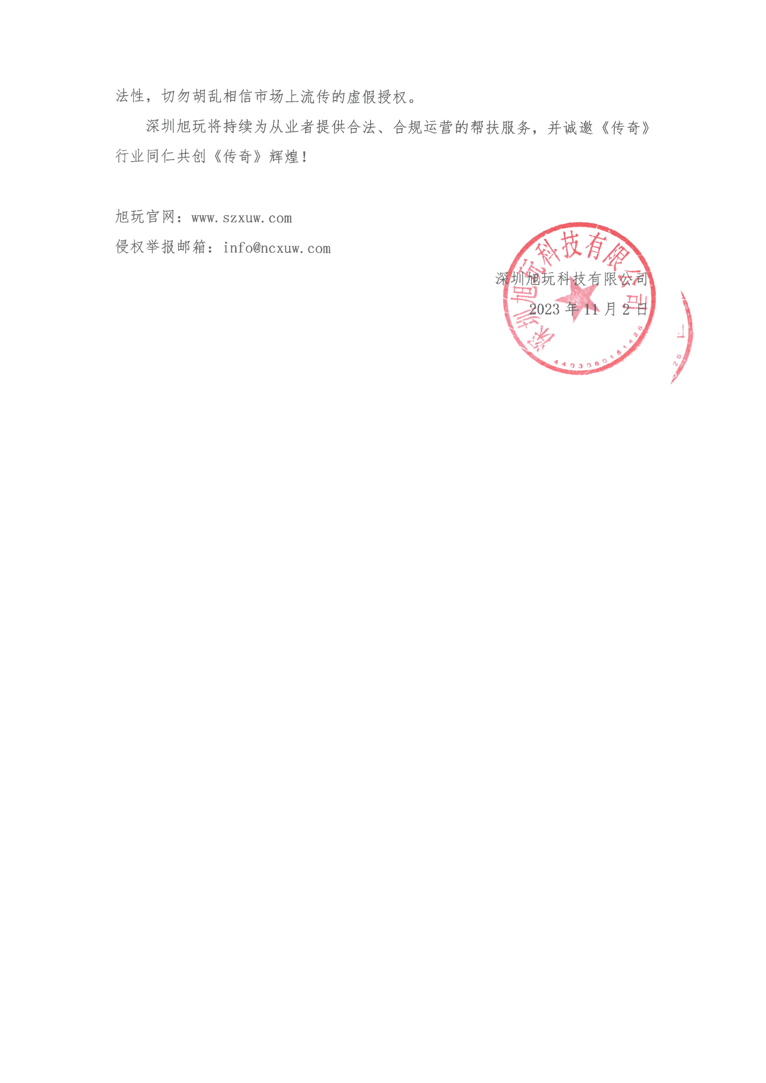 深圳旭玩科技有限公司(以下簡稱“我司”)于2023年4月28日依據相關轉授權文件獲得了原始著作權人韓國亞拓士軟件有限公司針對《Legend of Mir II》(中文名:《傳奇》)網絡游戲PC端維權的獨占性權利,以及基于維權目的開發、運營《傳奇》作品PC端非官方版本并進行轉授權、分授權的權利。自獲得授權以來,我司積極打擊違法侵權行為,凈化網絡環境,大力推動《傳奇》游戲的合法授權制度,依法維護《傳奇》著作權人的合法權益。