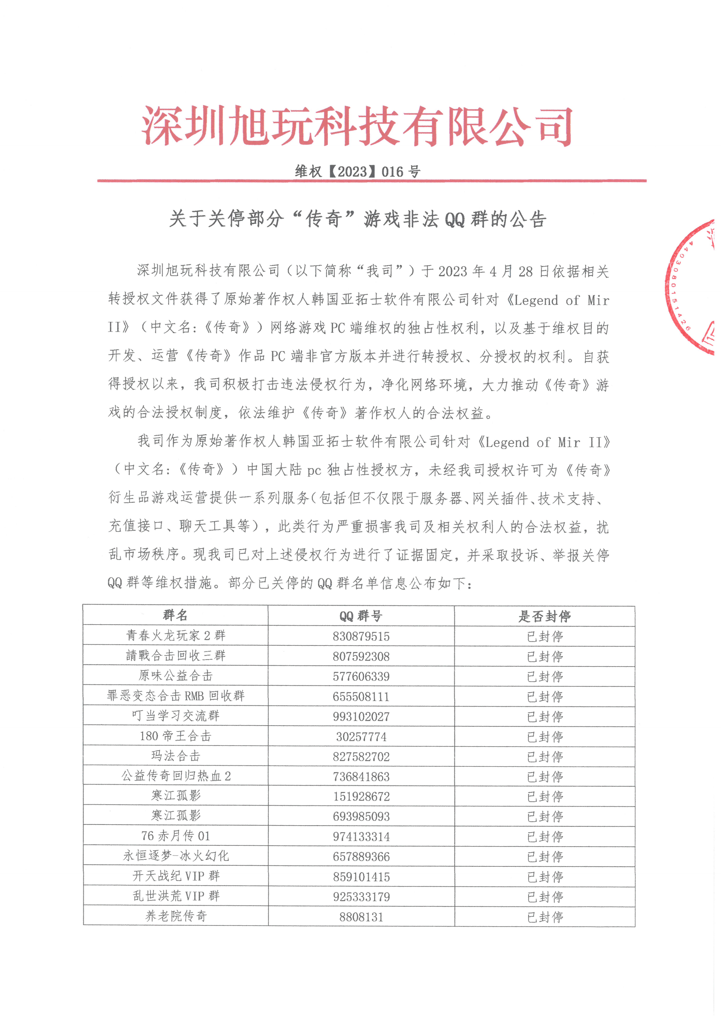 我司作為原始著作權(quán)人韓國亞拓士軟件有限公司針對《Legend of Mir II》(中文名:《傳奇》)中國大陸pc獨占性授權(quán)方,未經(jīng)我司授權(quán)許可為《傳奇》衍生品游戲運營提供一系列服務(wù)(包括但不僅限于服務(wù)器、網(wǎng)關(guān)插件、技術(shù)支持、充值接口、聊天工具等),此類行為嚴重損害我司及相關(guān)權(quán)利人的合法權(quán)益,擾亂市場秩序。現(xiàn)我司已對上述侵權(quán)行為進行了證據(jù)固定,并采取投訴、舉報關(guān)停QQ群等維權(quán)措施。部分已關(guān)停的QQ群名單信息公布如下: