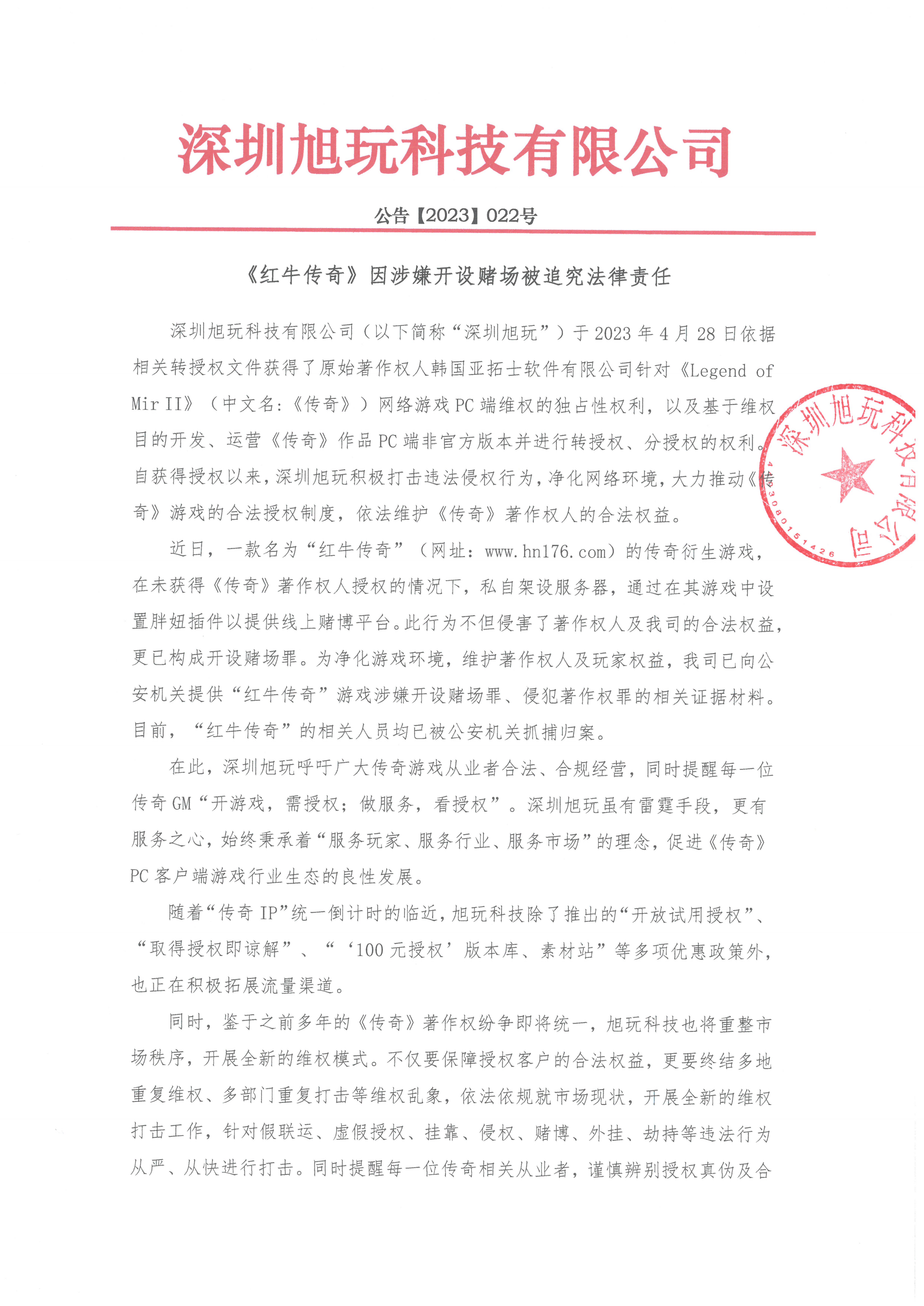 深圳旭玩科技有限公司(以下簡稱“深圳旭玩”)于2023年4月28日依據相關轉授權文件獲得了原始著作權人韓國亞拓士軟件有限公司針對《Legend of Mir II》(中文名:《傳奇》)網絡游戲PC端維權的獨占性權利,以及基于維權目的開發、運營《傳奇》作品PC端非官方版本并進行轉授權、分授權的權利。自獲得授權以來,深圳旭玩積極打擊違法侵權行為,凈化網絡環境,大力推動《傳奇》游戲的合法授權制度,依法維護《傳奇》著作權人的合法權益。