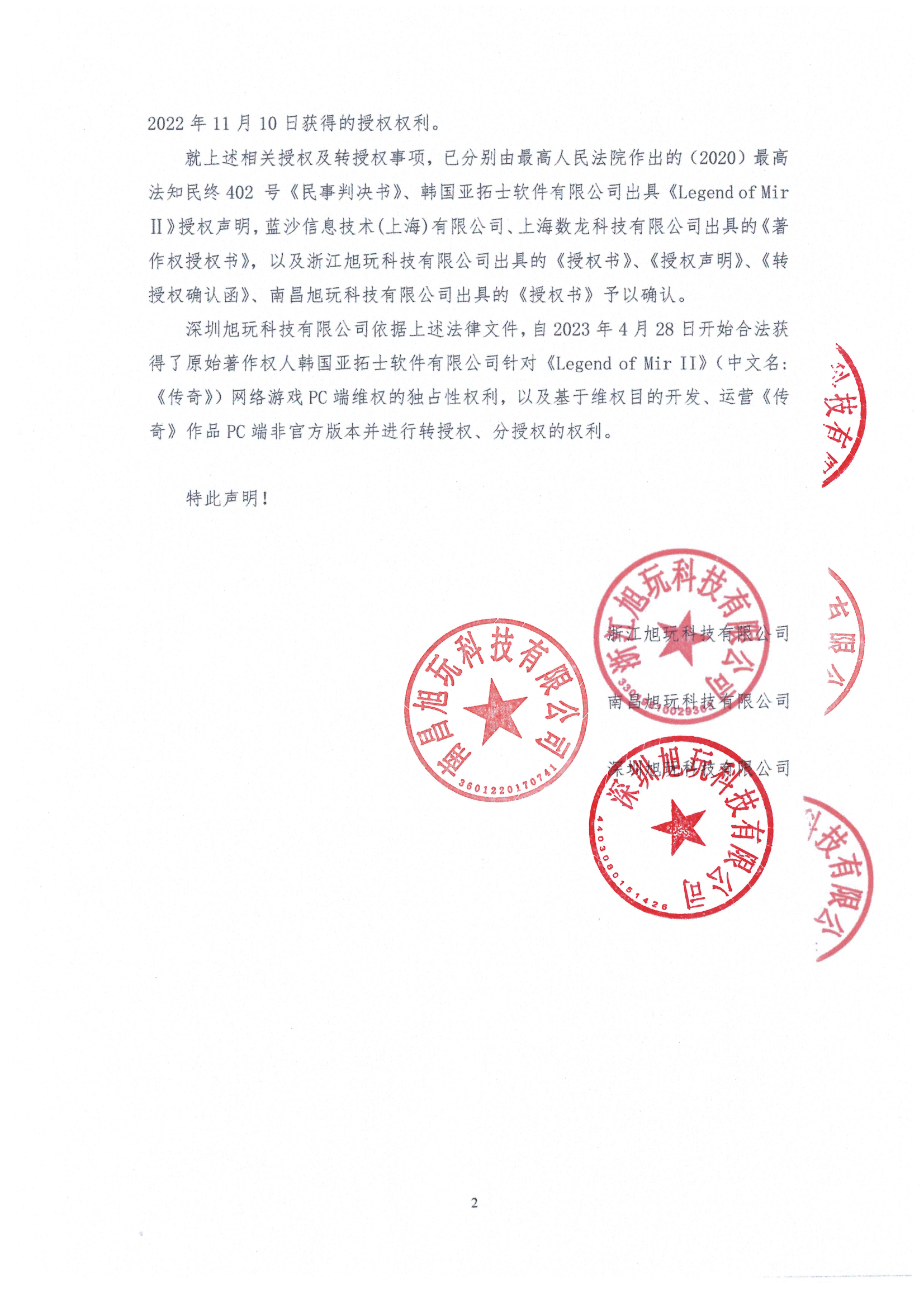 2022年11月10日,浙江旭玩科技有限公司轉授權南昌旭玩科技有限公司行使網絡游戲《Legend of Mir Ⅱ》(中文名“傳奇”)非官方版本(僅限于PC客戶端游戲)在中國大陸地區的開發、運營、維權權利及基于維權目的之轉授權權利。