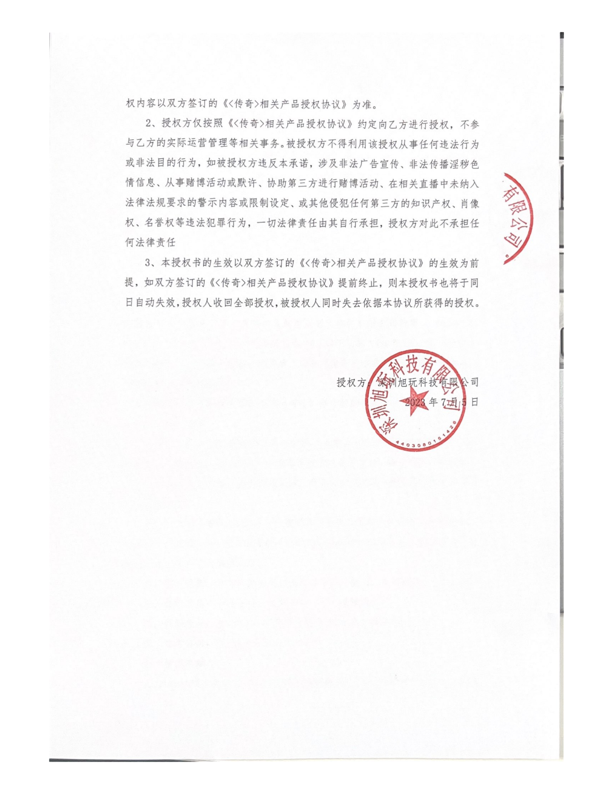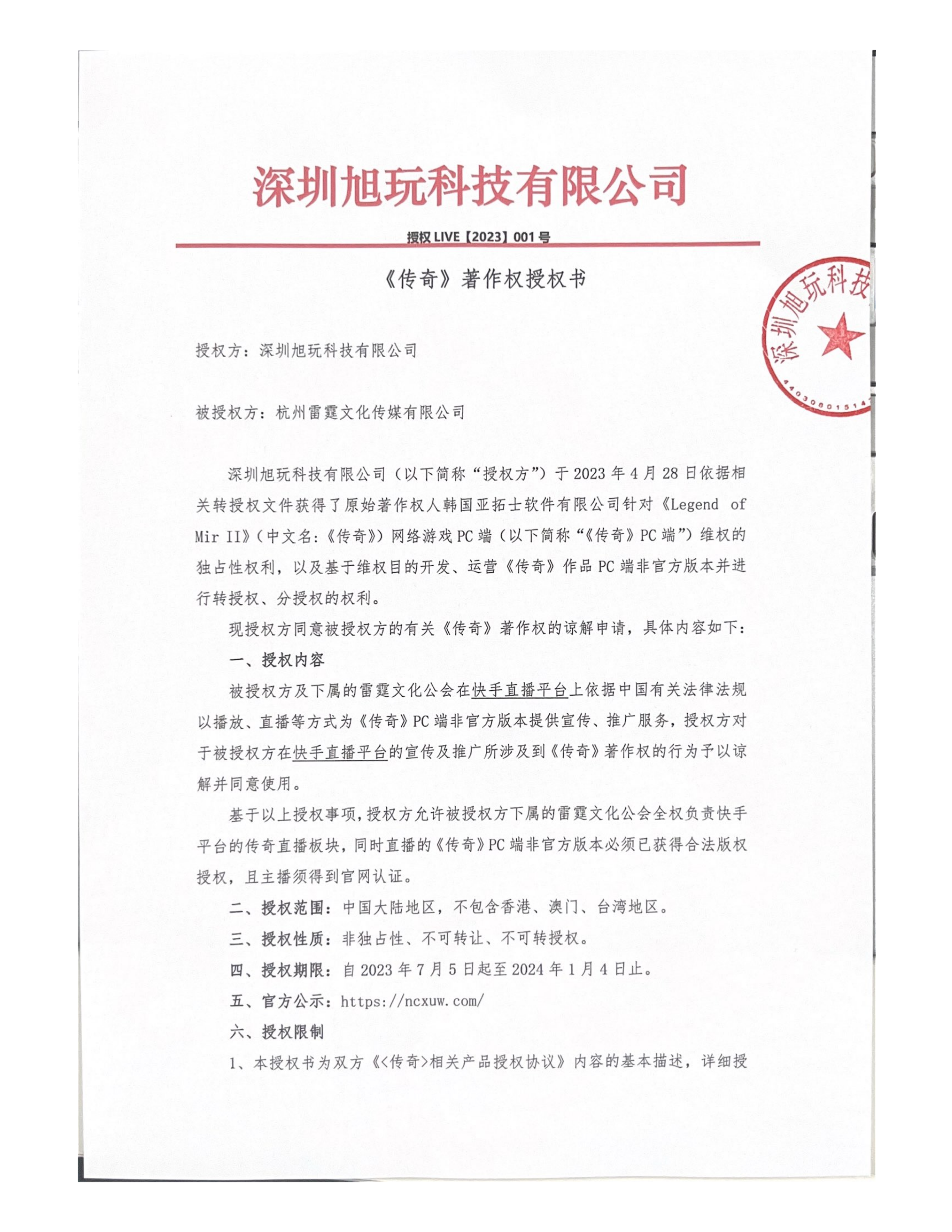 官方公示:杭州雷霆文化取得深圳旭玩《傳奇》直播授權書