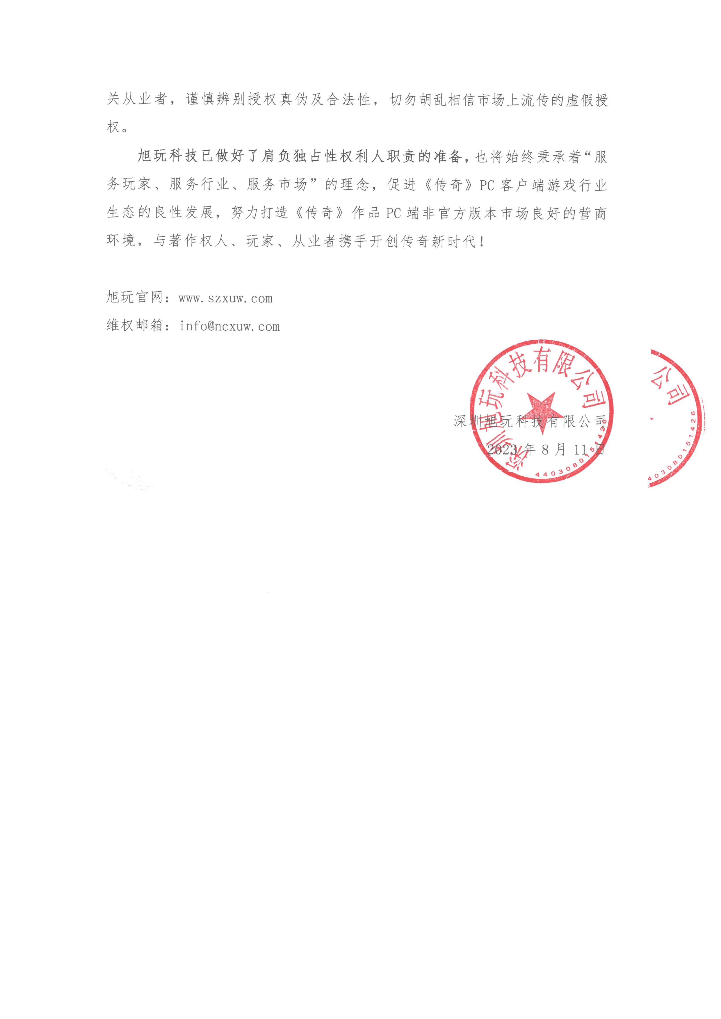 旭玩科技已做好了肩負獨占性權利人職責的準備,也將始終秉承著“服務玩家、服務行業、服務市場”的理念,促進《傳奇》PC客戶端游戲行業生態的良性發展,努力打造《傳奇》作品PC端非官方版本市場良好的營商環境,與著作權人、玩家、從業者攜手開創傳奇新時代!